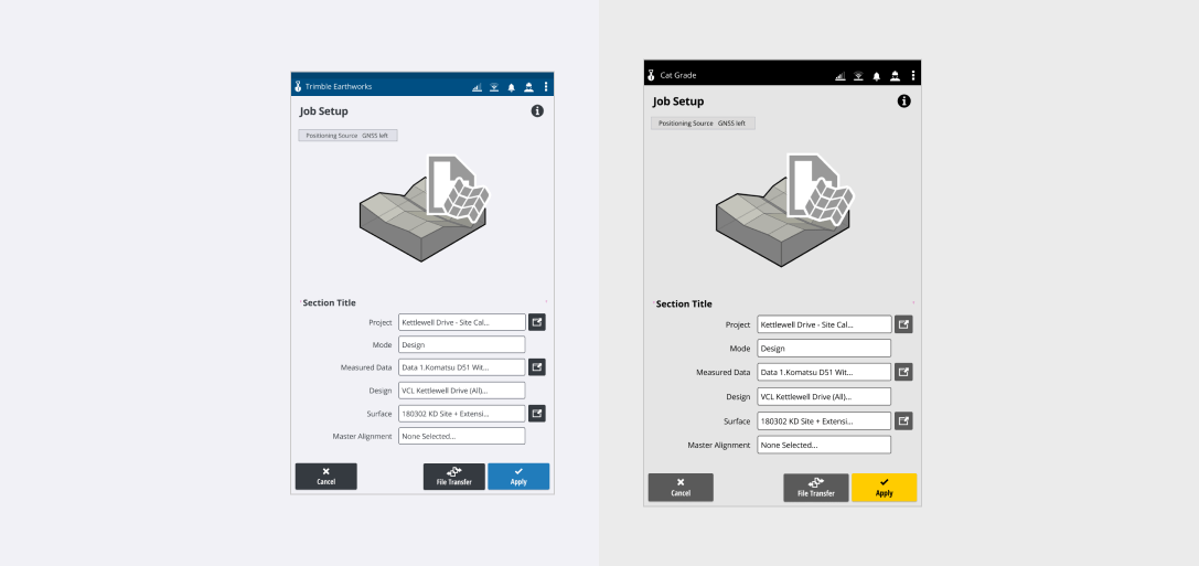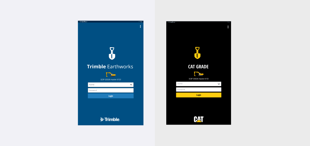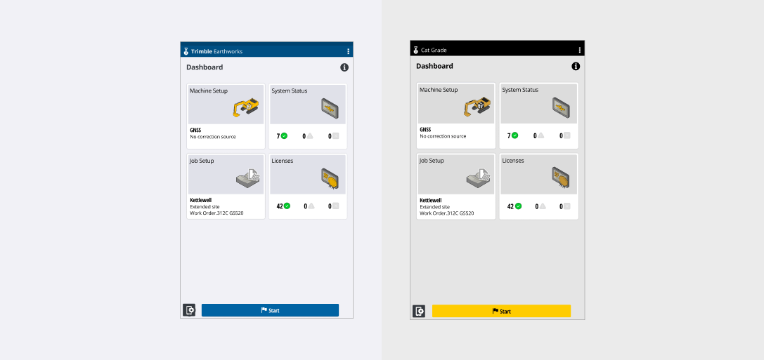 Trimble and OEM Brand Variations, or Themes, are applied on top of the user-centric brand base. This may include variations to color, iconography, imagery and models, splash screens, and logos, for example.