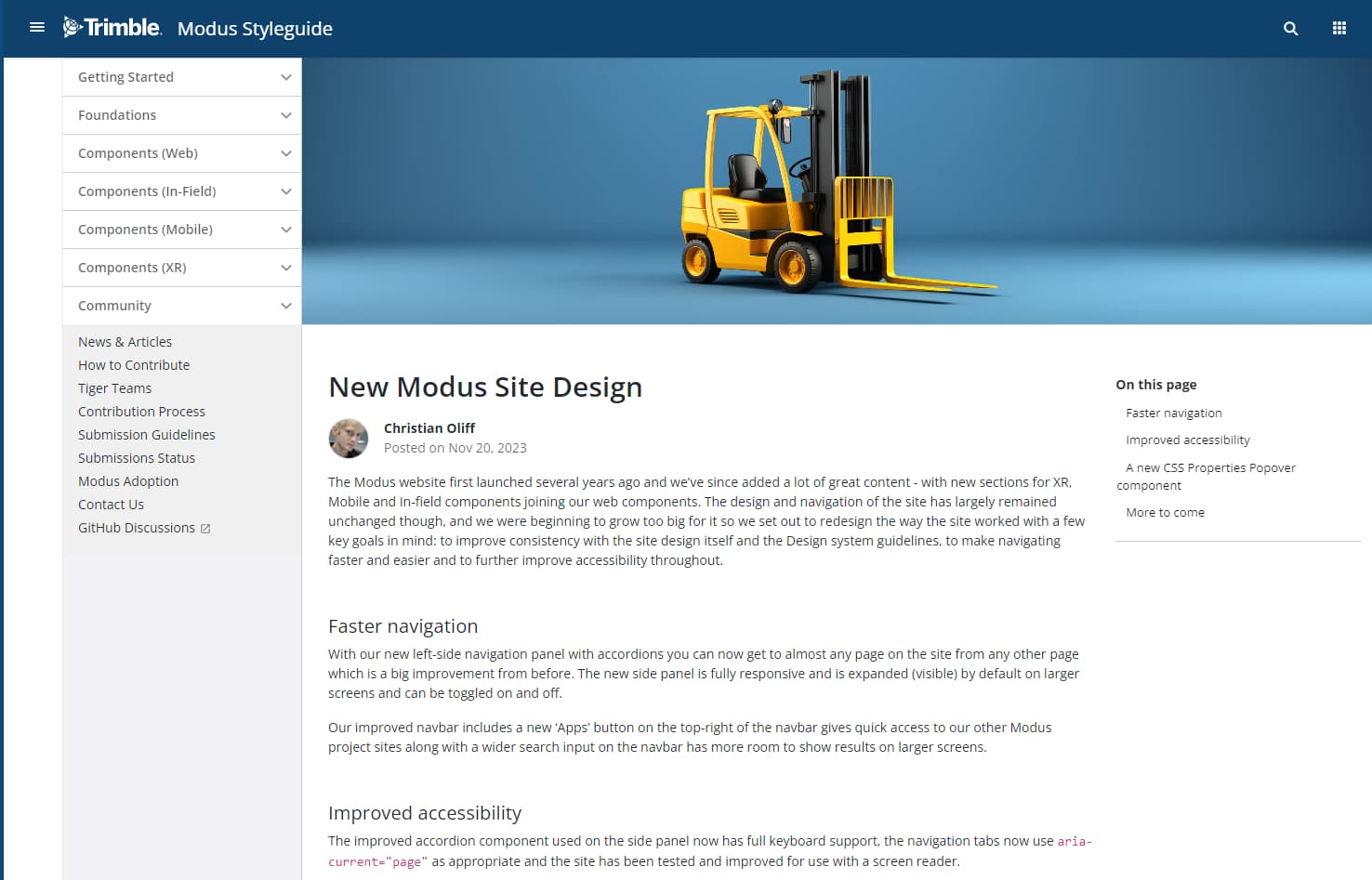 The Modus website first launched several years ago and we’ve since added a lot of great content - with new sections for XR, Mobile and In-field components joining our web components. The design and navigation of the site has largely remained unchanged though, and we were beginning to grow too big for it so we set out to redesign the way the site worked with a few key goals in mind: to improve consistency with the site design itself and the Design system guidelines, to make navigating faster and easier and to further improve accessibility throughout.